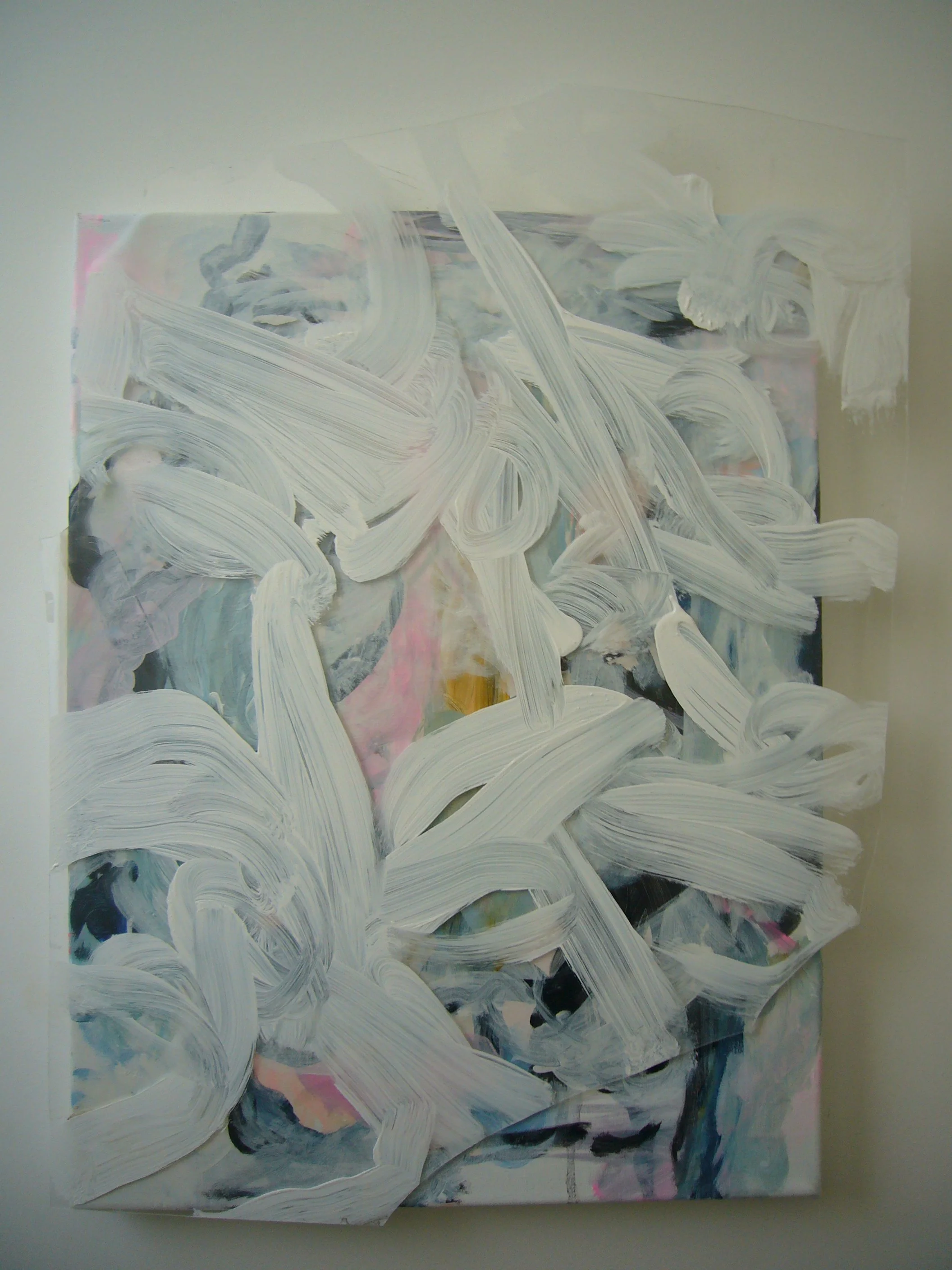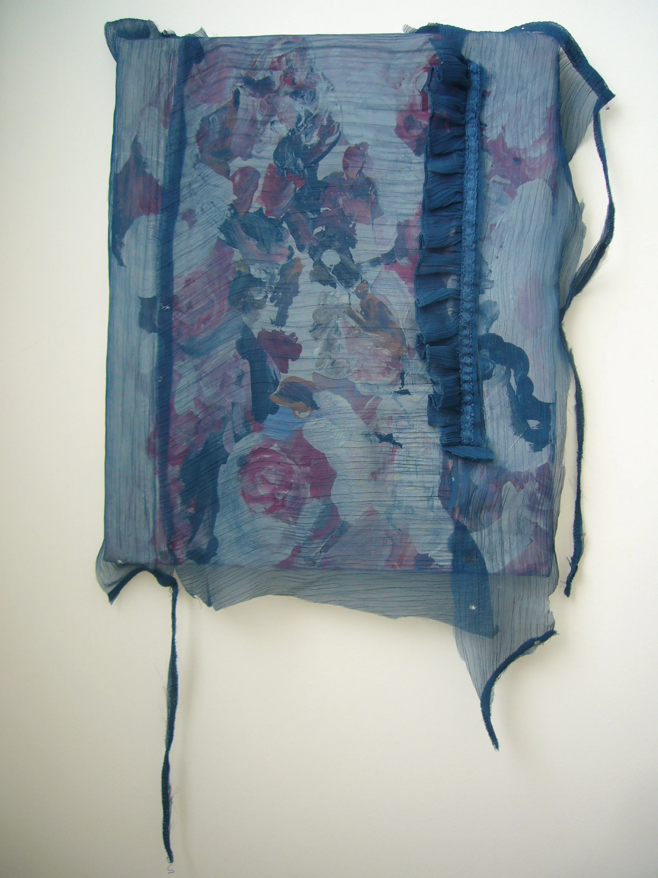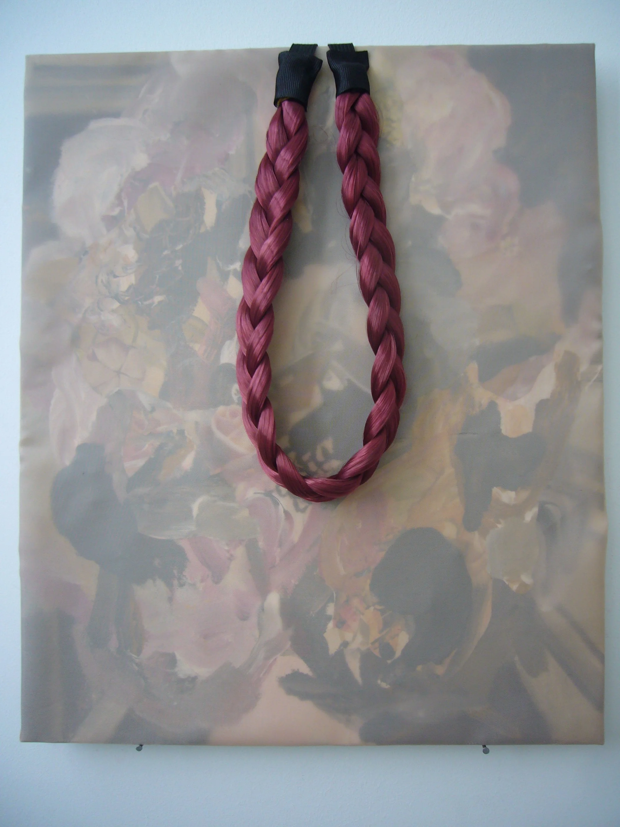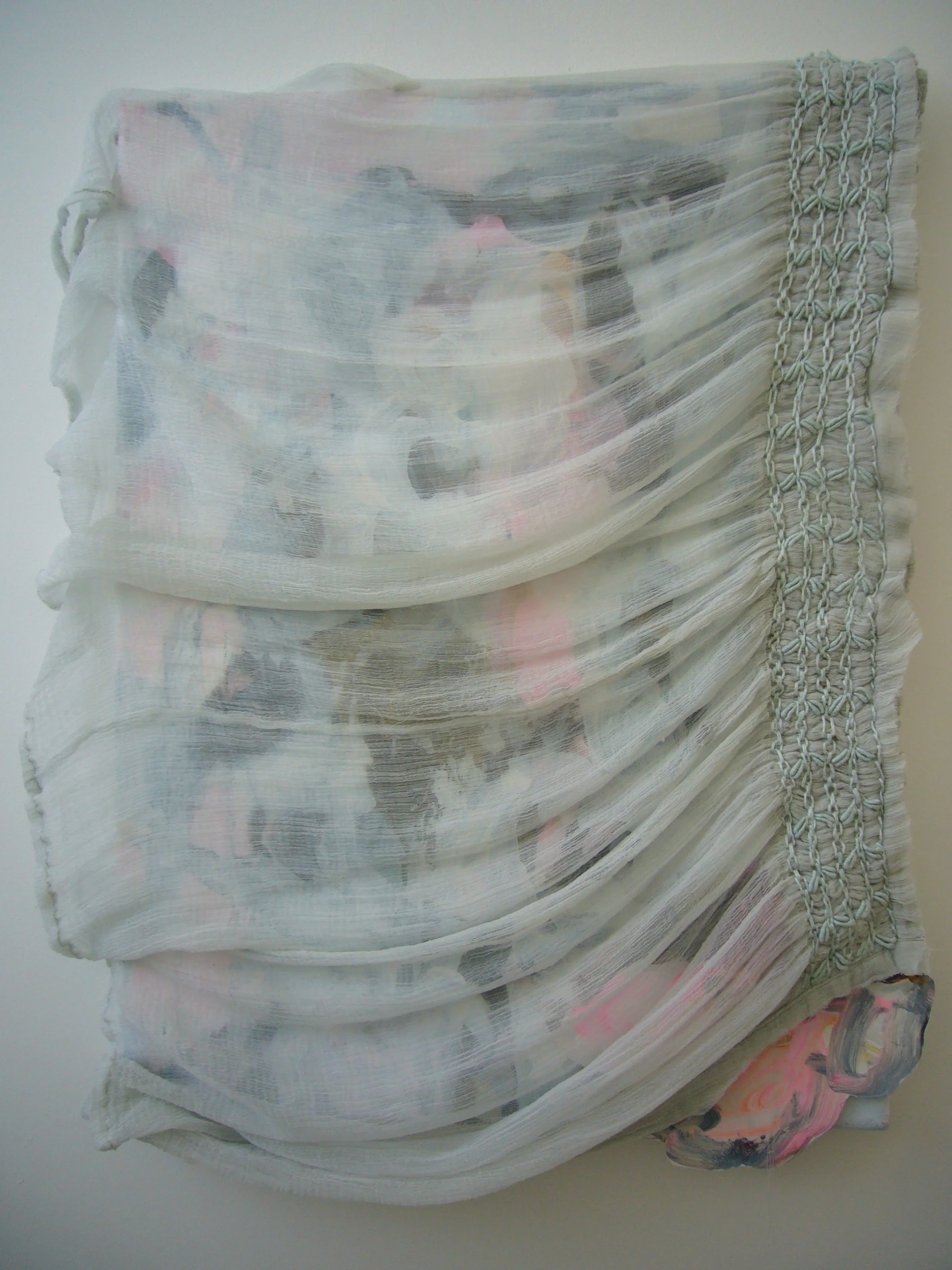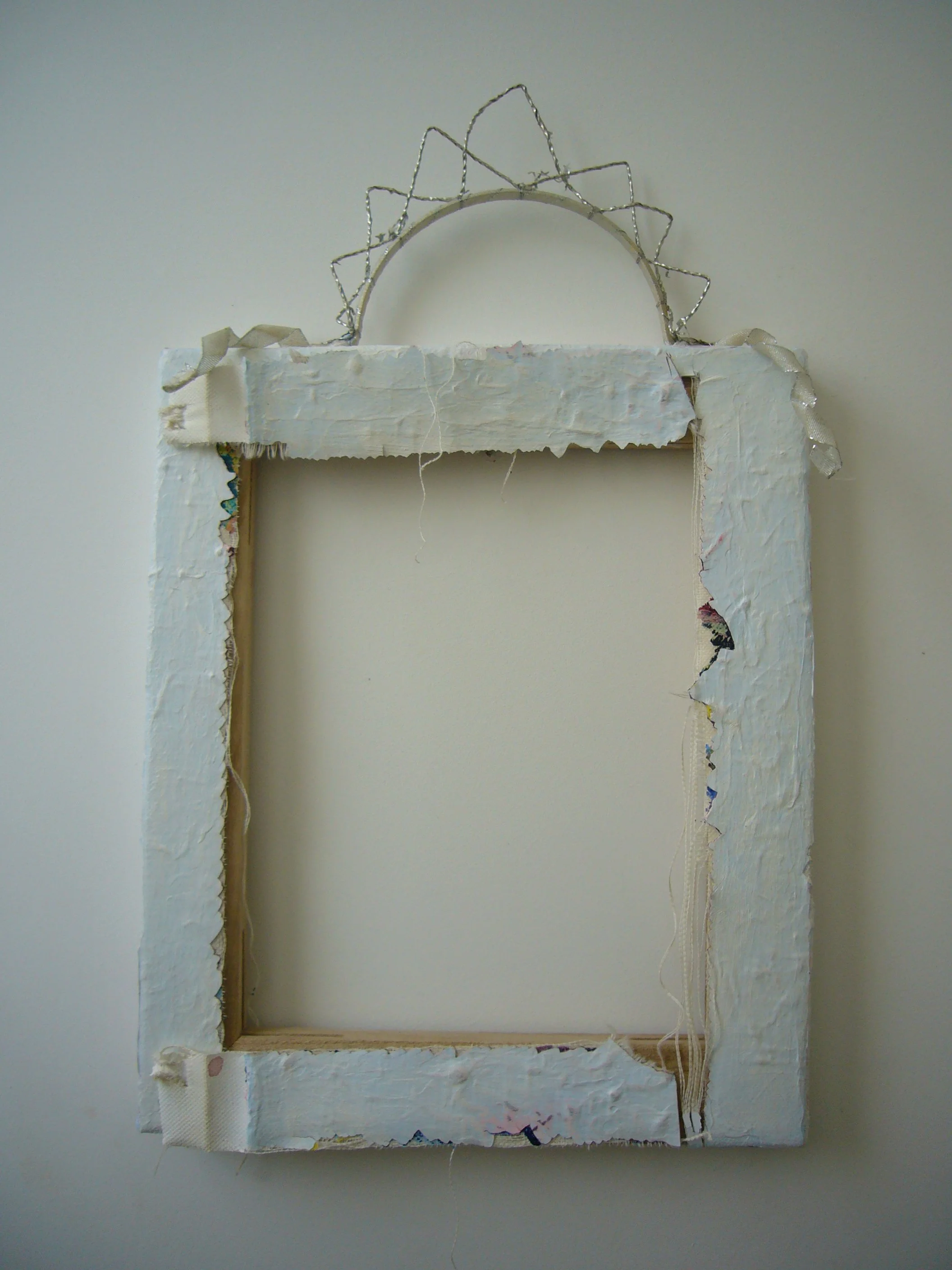 Acrylic, fabric, ribbons, found objects on canvas, various dimensions